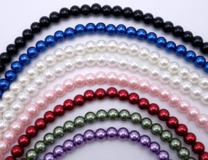 They cost a lot less than real pearls or gemstones, look almost the same, and lack the grooving found in cheaper natural pearls. They are more varied, in different shapes and bright colours like yellow, red, green and blue – as well as sparkling shades like aqua, magenta and rose.